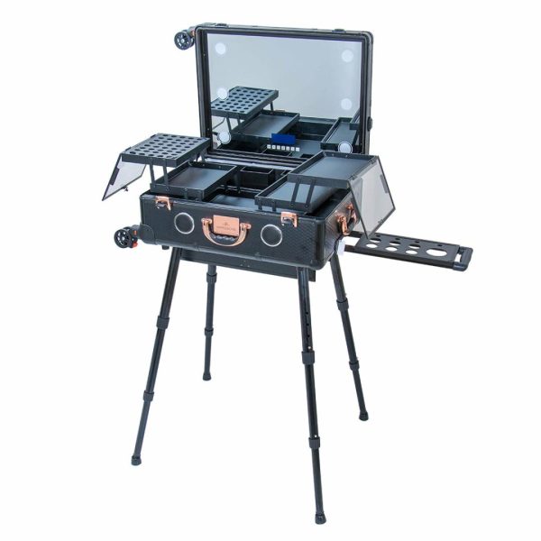 Our largest SlayCase® just got an upgrade! Introducing the SlayCase® Pro Lux, the pinnacle of on-the-go glam storage, with many features that make it stand out from the rest! From the built- in mirror with LED duotone lighting, Built-in speakers, and deep, tiered storage, this case is a dream to an artist on the go! There is plenty of space to store your essentials within the case with the extendable, double tiered storage, included brush holders and a handy rectangular organizer can be placed on the handle to hold the large electric tools like blow dryers, flat irons, etc. Control the speakers, volume and lighting settings with the LED screen and touch sensor buttons. Situated on 360 spinner wheels, you can easily roll this case wherever you go or fold out the 4 legs and get an instant vanity table!